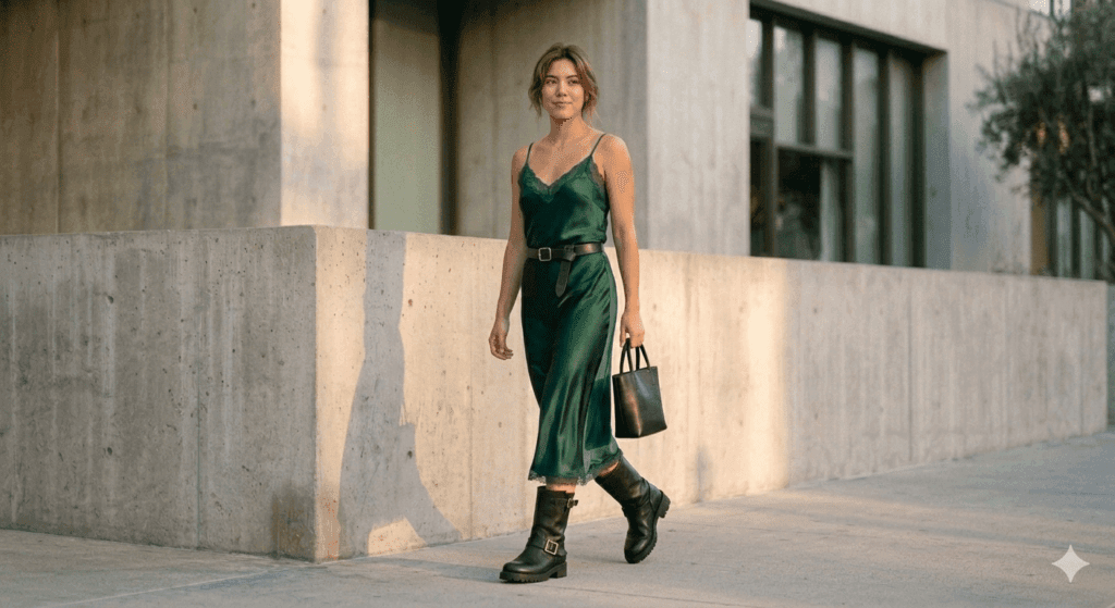 El contraste de texturas es la clave de 2026. Un vestido lencero de satén o uno de punto acanalado que llegue a media pierna, contrastado con la robustez de unas botas tipo biker.