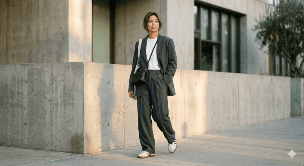 La sastrería ya no es rígida. El must-have es un traje de dos piezas en tonos tierra o gris carbón, con pantalones de pinzas anchos y una americana oversize.