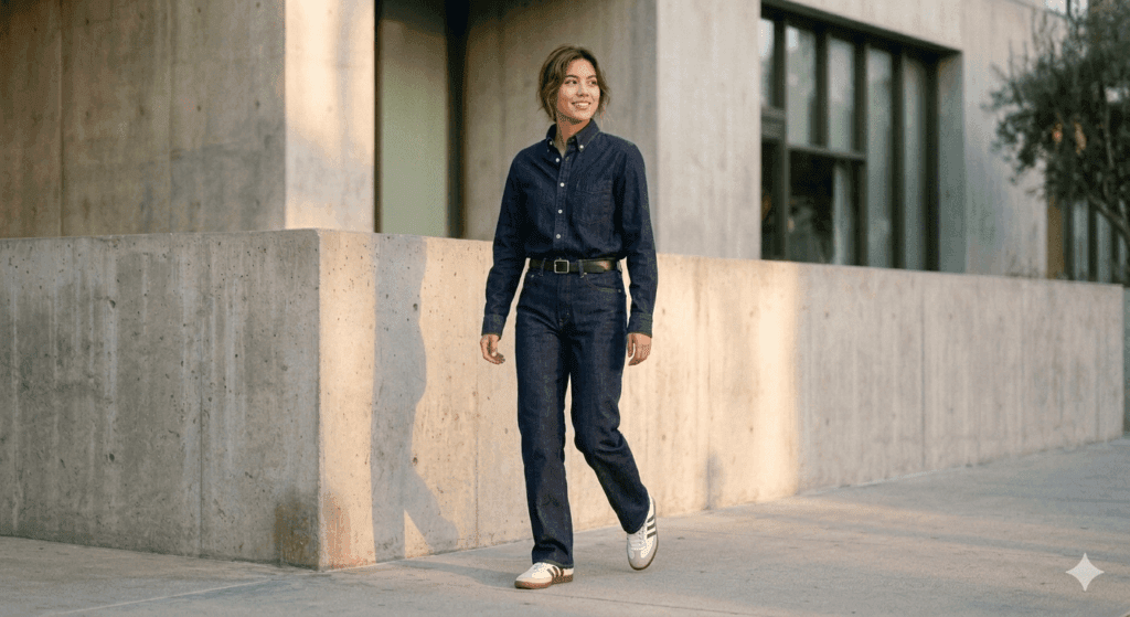 - El toque maestro: Una camisa denim abotonada hasta el cuello fajada dentro de unos jeans de corte recto, rematado con un cinturón de piel negra y hebilla minimalista.
